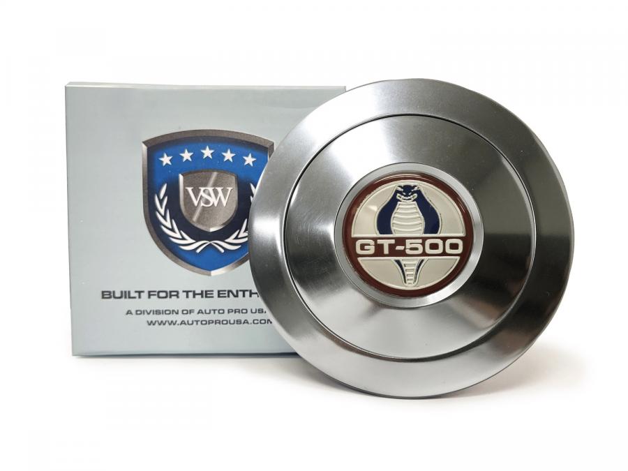 This VSW S9 Premium Billet Aluminum Pressure Fit 9-Bolt Steering Wheel Horn Button features a Ford Licensed GT500 Emblem