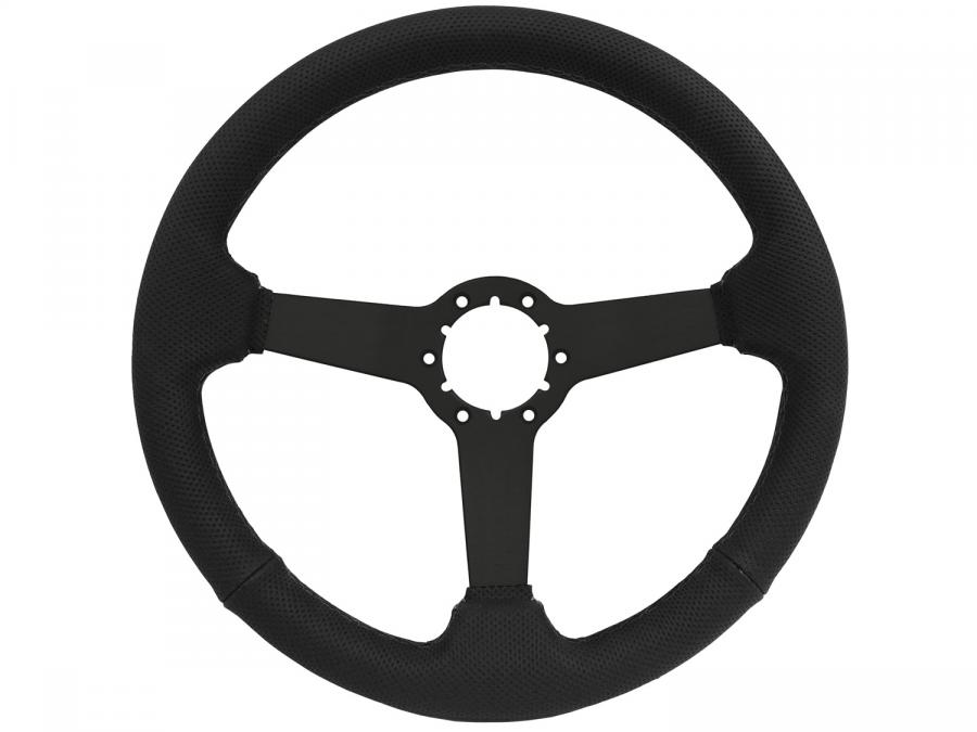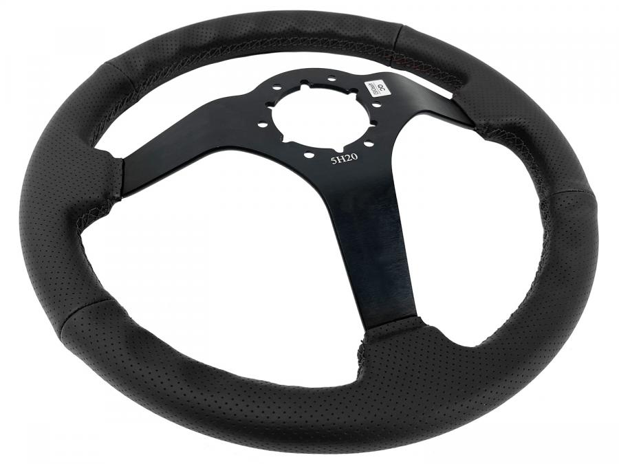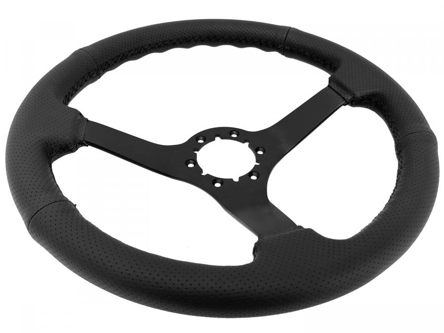 S6 Sport Leather steering wheel series come in perforated black leather grip with black stitching option with black anodized center finish and solid spoke design. They feature a 14 in. diameter with a 2.5 in. depth for turn signal clearance.