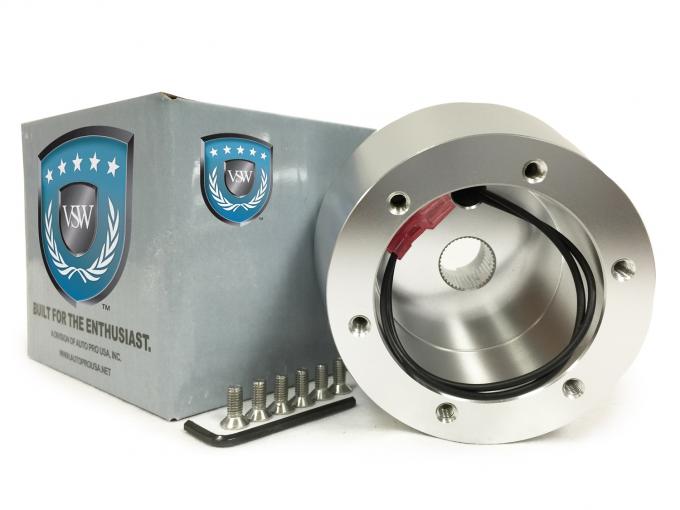 S6 Hub adapter is made from highly polished billet aluminum materials, anodized clear. Billet aluminum is CNC machined to create a perfect fitting hub. It includes horn-button wiring and hardware set. S6 Hub adapter can be used with any VSW S6 series steering wheels, horn caps and licensed emblems.
