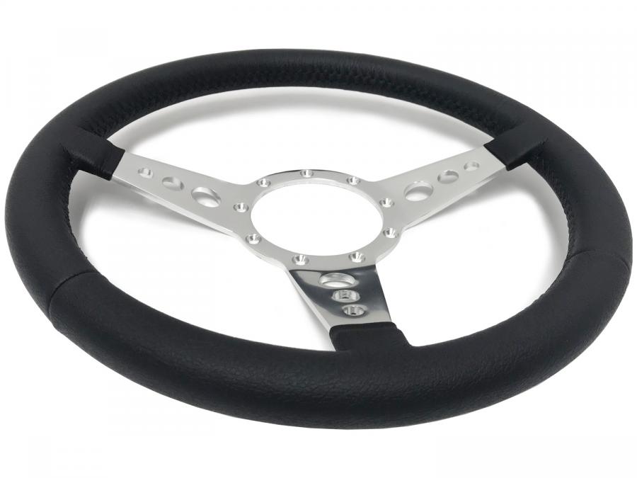 S9 steering wheel series come in premium leather grip option with polished aluminum anodized center finish. They feature a 14 in. diameter with a 2 in. depth for turn signal clearance. The grip thickness is 1.25 in.