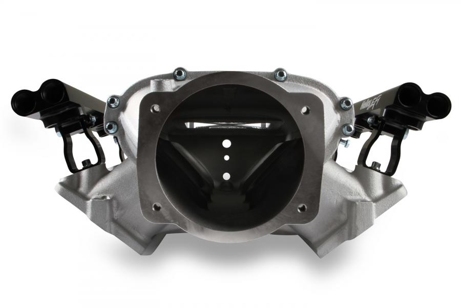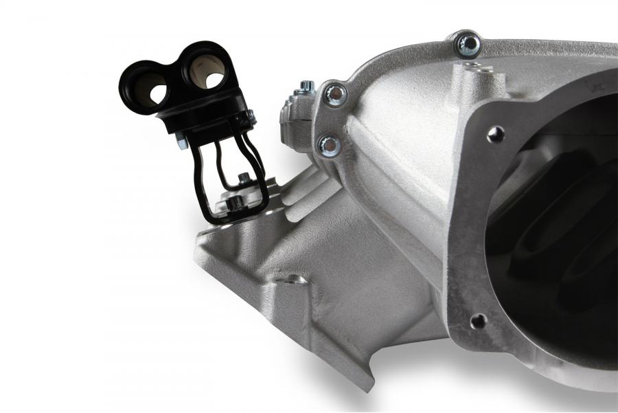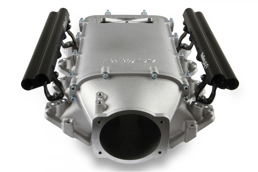 The short runner, low-profile base intake manifold was conceived to package with high-boost turbocharged or supercharged induction systems with a short overall height not possible with other existing intake manifolds. This Holley Ultra Lo-Ram kit is configured for a 105mm throttle body, see Holley P/N 112-581 or similar models. The fuel rail kits come with two sets of brackets. A set for long (usually standard length) fuel injectors and a set for short (such as Pico, or LS7) fuel injectors.