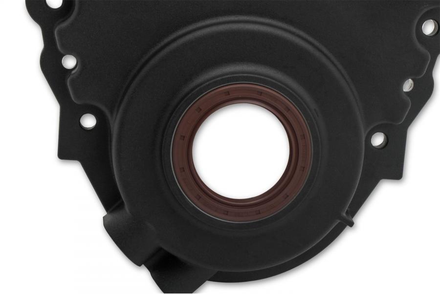- Includes over-molded FKM oil seal, virtually eliminating concerns of the seal spinning out at high temperatures, which is common with other aluminum timing covers