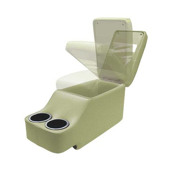Featuring 2 cup holders (1 standard, 1 king size) with chrome accents & a storage compartment with a soft padded flip open lid, the Humphugger console is designed to fit between the bucket seats on the carpeted transmission hump.