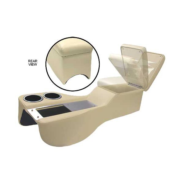 Featuring 2 king size cup holders, with chrome accents, a storage compartment with a soft padded flip open lid & now a beautiful brushed aluminum trim plate the Humphugger Cruiser Console is designed to fit between the bucket seats on the carpeted transmission hump.