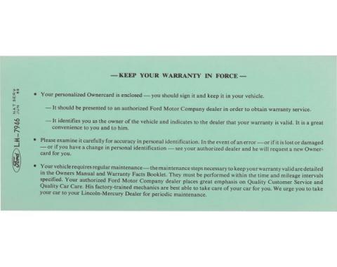 Ford Mustang Warranty Card Instruction Sheet - Personalized - Through Early 1969