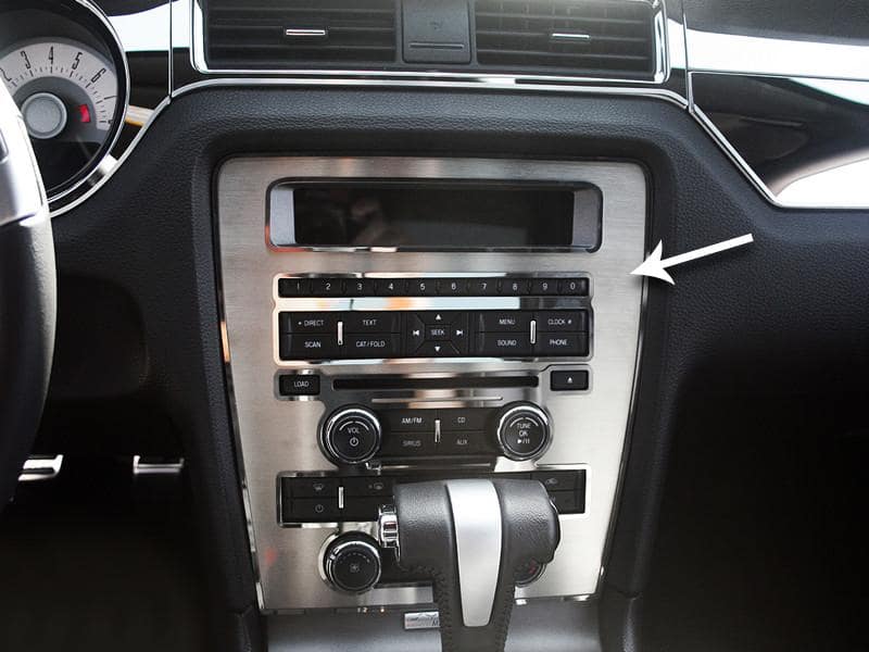 Dress up your Mustang with our brushed stainless steel Center Dash/Radio/AC Trim Plate with Polished Trim Rings. These trim pieces are designed to fit on the center dashboard around the radio and a/c controls and add a clean stylish look to your Mustang interior.