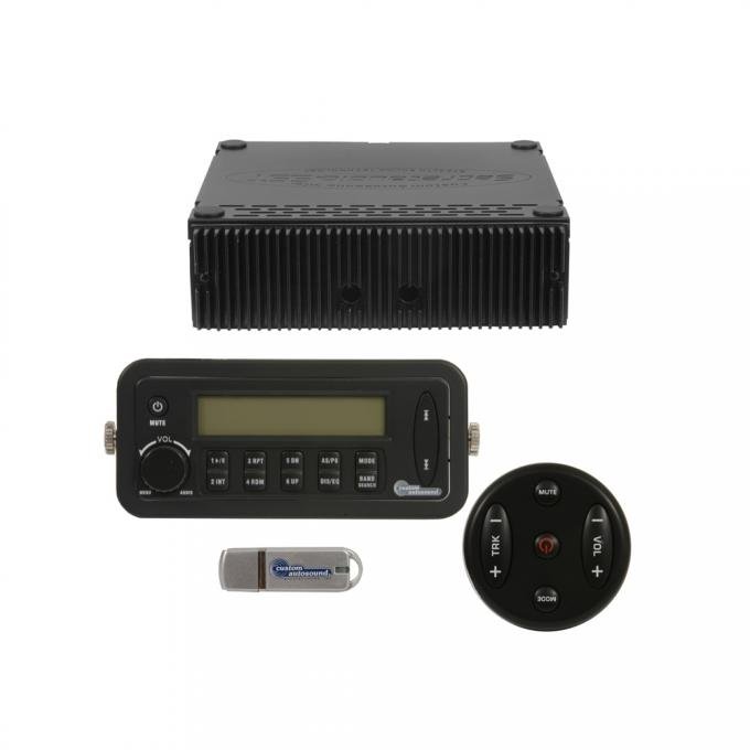 Hideaway 200 Watt AM/FM CD controller with USB MP3/WMA Flash Drive, iPod interface and more. Featuring “RF” (radio frequency) remote control.  Ideal for Streetrods, Classics, Customs or any Vehicle! Leave original radio intact!  The tuner/amplifier unit (black box) can be hidden out of site (under seat, dash or trunk) .  We have even included the iPod docking cable (iPod not included).