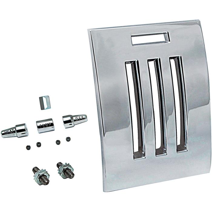 Reproduction of the original heater switch plate designed for use on 1964-66 Mustangs. Each plate is a manufactured to duplicate the original in quality and appearance. This is the chrome die-cast metal plate that the heater control switch arms slide through. Includes attaching bolts with nuts. Pressure die cast and chrome plated. Superb chrome plating on the face. Includes mounting studs and nuts. Also includes a complete set of four chrome die-cast knobs with the correct "HEAT", "TEMP" & "DEF" lettering along with set screws for installation. Careful attention has been paid to detail with the black painted lettering. Replace the heater plate and knobs with this convenient kit.