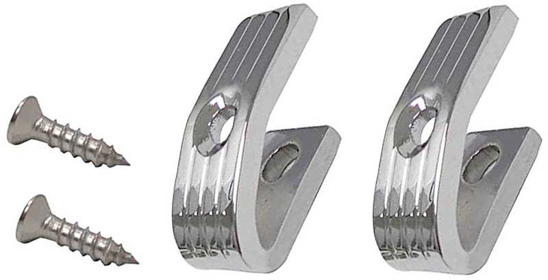 Autnentic reproduction of the original style coat hooks designed for use with various Ford models including 1964-66 Mustang convertible, 1967 Mustang (all), 1960-63 Falcon, 1960-63 Fairlane, and 1960-63 Comet convertible models. Each hook is manufactured in die-cast zinc to factory dimesions replicating the original in design and appearance. See listing below for correct applications for convertible and coupe models. Includes mounting screws. Sold in pairs.