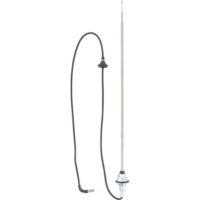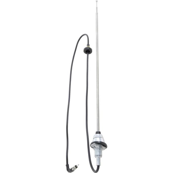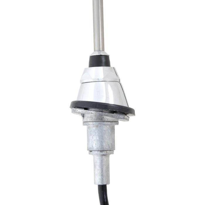 Reproduction radio antenna with round base for 1964-68 Mustang and other models with telescopic mast. This authentic reproduction includes the antenna, installation hardware, cable, and gasket.