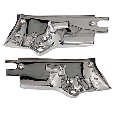 Beautifully reproduced sun visor brackets designed for use on 1964-66 Mustang convertible models. These triple chrome plated brackets attach to the windshield header (03606) and include the pivots to mount the visor rods. Brackets and pivots will install using original or reproduction rods and sun visors. Sold in pairs including RH and LH brackets. Note: Visor rods and header molding are available separately.