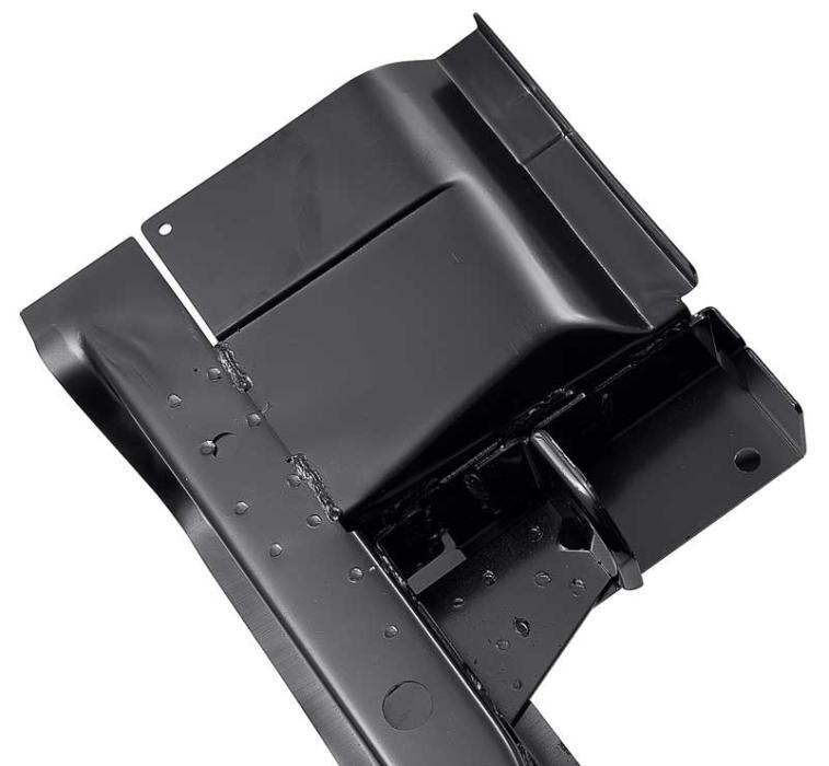 Reproduction of the original rear frame rail for use with 1964-68 Ford Mustang coupe models. Each frame rail is manufactured to original factory specifications replicating the original in quality, design, and fitment. This heavy gauge steel frame rail attaches to the lower rear of the body structure and extends all the way back to just past the rear leaf spring shackle mount. Includes the rear upper and lower torque box, front leaf spring mount, rear leaf spring shackle mount with rubber bushings, and the rubber axle bumper.