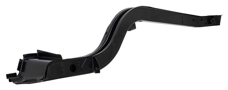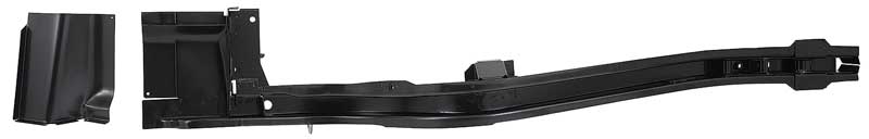 Reproduction of the original rear frame rail for use with 1964-68 Ford Mustang coupe models. Each frame rail is manufactured to original factory specifications replicating the original in quality, design, and fitment. This heavy gauge steel frame rail attaches to the lower rear of the body structure and extends all the way back to just past the rear leaf spring shackle mount. Includes the rear upper and lower torque box, front leaf spring mount, rear leaf spring shackle mount with rubber bushings, and the rubber axle bumper.