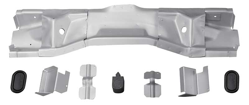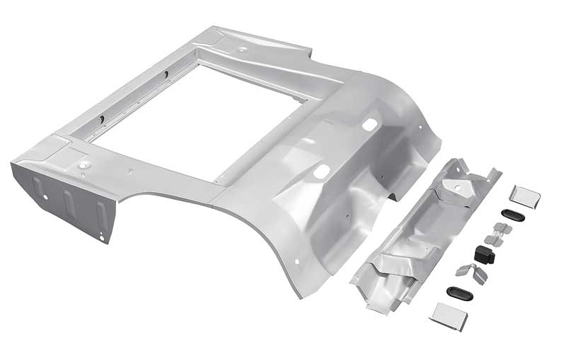 This is the full reproduction stamped steel floor pan assembly to fit 1964-70 Mustang Convertible in Weld-Thru primer. The main structural part begins at the rear seat divider and goes back towards the taillight panel. Included is the trunk floor extensions and the inner trunk brackets. There is also a panel where the pinion snubber attaches. The opening is where the fuel tank sits.