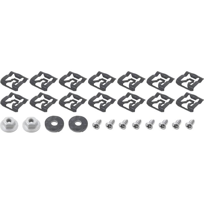 Includes 14 Clips, 6 screws and 2 rubber padded washers and 2 nut retainers.