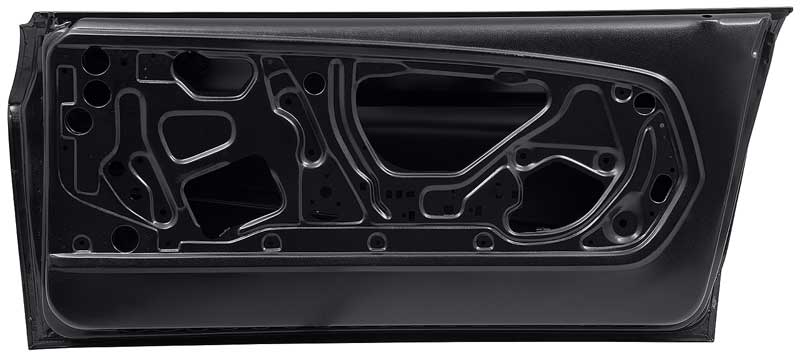Reproduction of the original style complete door shell for use with 1967-68 Ford Mustang models. Each outer door shell is manufactured in stamped steel to original factory specifications featuring correct contours for an authentic appearance and fit. Features correct location of all mounting holes for window and door latch mechanisms, door hinges and inside door panels. Authentic stamped grain on interior door surfaces. Reproduction door shells are sold as a replacement for the sheet metal portion only, without any internal components, hardware or glass.