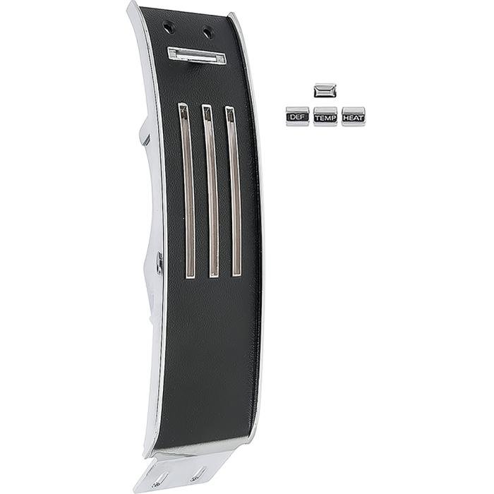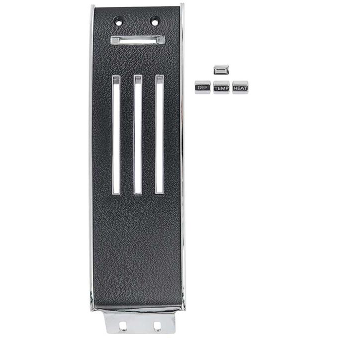 Chrome plated heater control dash plate features correct black pebble grain (camera case finish) center inset. Includes heater, temperature, defrost and fan knobs. Will ONLY fit 1967 Mustangs without factory A/C.