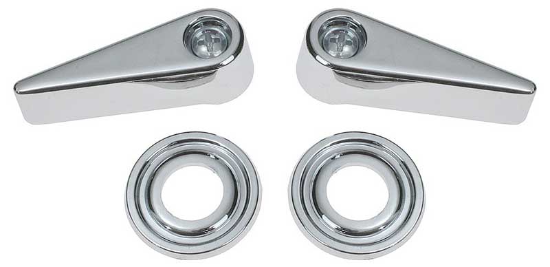 Fits 1968-69 Mustang, Cougar, Fairlane, Ranchero, and Bronco models. Each 4-piece set includes two handles and two chrome bezels.