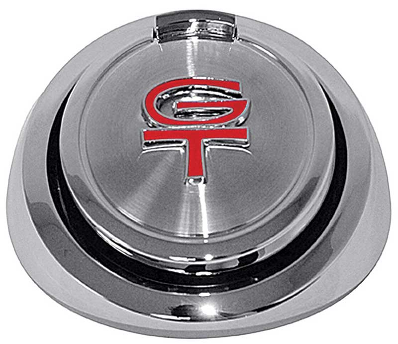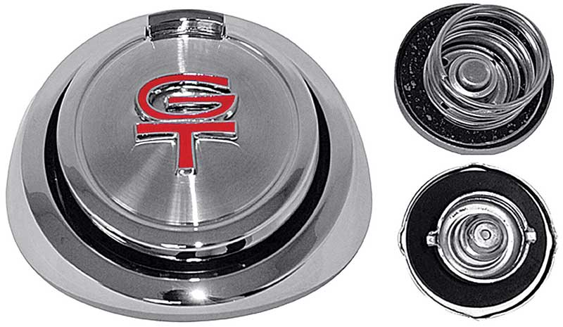 Reproduction GT pop open gas cap for 1968 models. Features an authentic brushed center with a bright chrome plated outer ring for a factory-style finish. Includes the red GT emblem, which comes separate from the cap, and includes mounting hardware for installation. OE Ford part number C8ZZ-9030-GT.