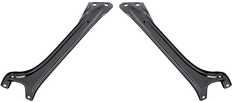 Reproduction of the original firewall-to-shock-tower brace set designed for 1967-68 Mustang and Cougar models. Manufactured from heavy gauge stamped steel replicating the original design, appearance, and fitment. Braces extend from the firewall across the engine bay to the shock towers. Sold in pairs.