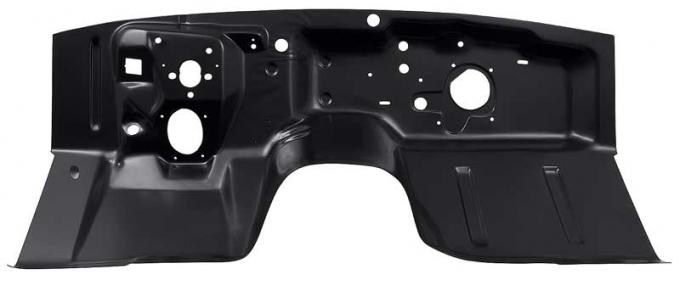 Reproduction of the original firewall panel for use with 1969-70 Ford Mustang and Mercury Cougar models. Includes the toe board panels along with the entire vertical panel that replaces the old or rusted original. Manufactured with heavy gauge stamped steel construction replicating the original in design, appearance, and fitment. This firewall panel is reproduced like the original with precise contours and stamped cut-outs for your Mustang. For use with Mustang coupe or fastback models, and Cougar coupe models. Can be modified to fit convertible body. Comes with black EDP coating that protects the panel from corrosion during shipment or storage.