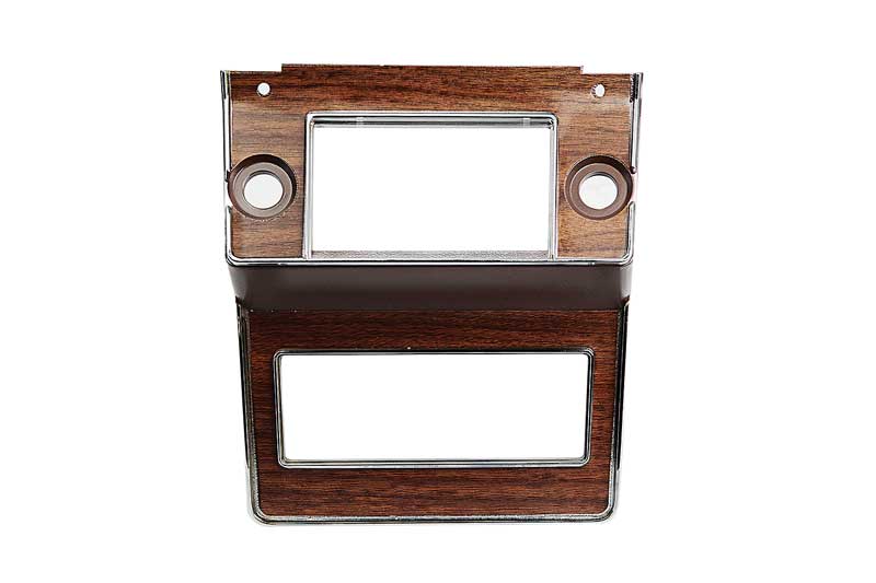 Reproduction of the original style woodgrain radio control bezel designed for use with 1969-70 Mustangs with the deluxe interior, or Mach 1 package. Features authentic dimensions and molding with accurate openings for radio nose piece, knobs and the ventilation controls in the lower part of the bezel. Features a bright trim with tan camera case painted surfaces to compliment the rich woodgrain surface treatment.