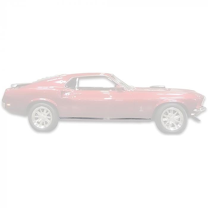 Reproduction of the original rocker panel molding that runs along the outer rocker panel of the exterior on your 1969 Mustang just below the door. Each molding is manufactured in quality stamped aluminum replicating the original in quality, design, and fitment. Includes hardware for installation.