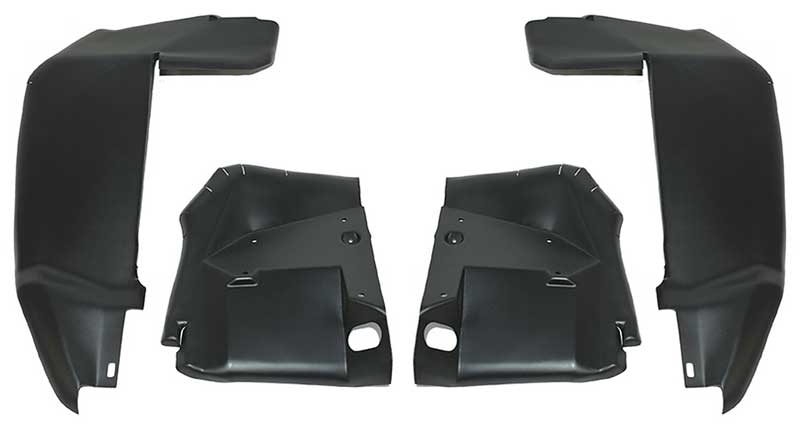 Reproduction front and rear plastic splash shield set for 1970 Mustang (except Shelby/Boss). Each shield is manufactured in injection-molded heavy plastic material and used to keep dirt and debris from gathering inside the fender well area. The 4 piece set includes 2 shields placed on the rear section of the fender behind the wheel well and 2 that install forward in front of the wheel well.
