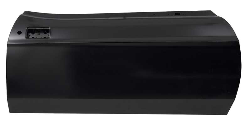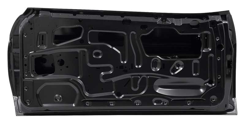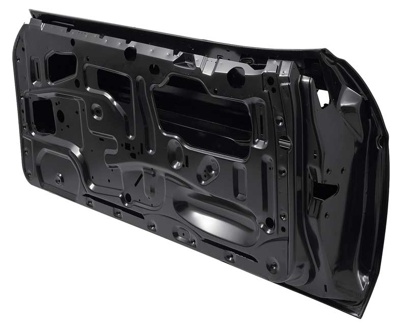 Reproduction of the original style full door shell designed for use with 1971-73 Ford Mustang models. Each outer door shell is manufactured from stamped steel to original factory specifications, featuring correct contours for an authentic appearance and proper fit. All mounting hole locations are accurately reproduced for window and door latch mechanisms, door hinges, and interior door panels. This reproduction door shell is intended as a replacement for the sheet metal portion only.