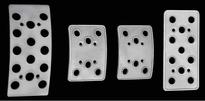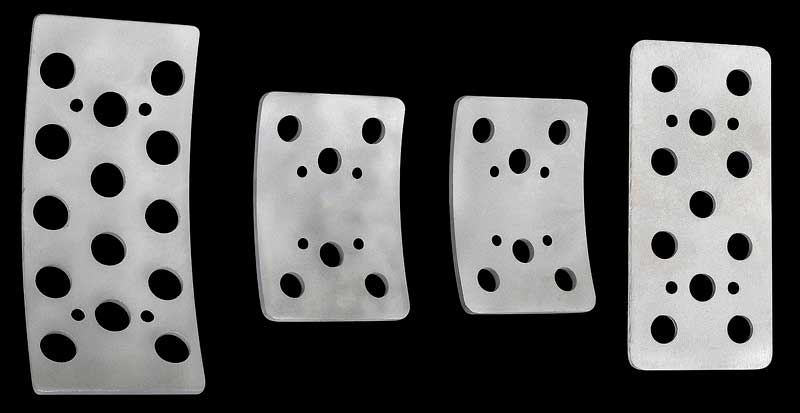 Aluminum racing pedal set for 1979-04 Ford Mustang models equipped with a manual transmission. Accelerator pedal measures 2-3/8" x 5-3/8"; brake and clutch pedals measure 2-1/2" x 3-1/2"; foot rest pedal measures 2-1/4" x 5". Includes drill bit, thread cutting tap, hex screws, and allen wrench. Made in USA with high quality 1/8" aluminum.
