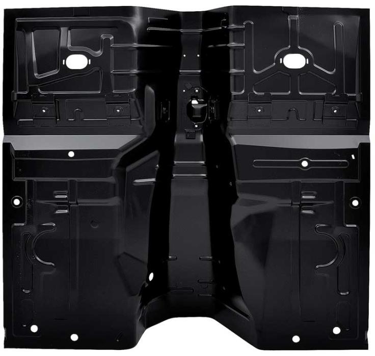 Reproduction floor pan for 1979-93 Ford Mustang models equipped with automatic transmission. Manufactured to factory specifications featuring correct contours, stiffening ribs, and drain holes. Comes finished in rust prohibitive primer for corrosion prevention.