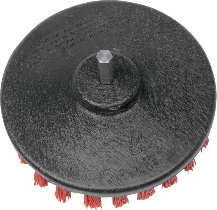 Use the drill brush with any drill. The red brush is heavy duty with very stiff bristles and is meant for intense scrubbing of hard surfaces. Use it to remove heavy grease, grime or loose paint.