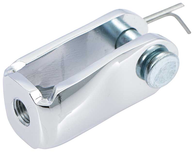 Brake pedal clevis for many potential uses, including connecting a brake master cylinder or power brake booster pushrod to the brake pedal arm. Measures approximately 2" long, is tapped for 3/8-24 fine thread, and is chrome plated to add some sparkle to your brake components. The listing indicates a variety of makes and models. This universal clevis can be adapted to most applications