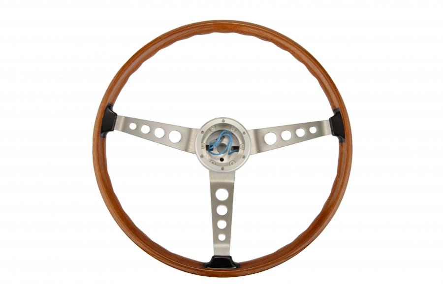 This Corso Feroce CS500 steering wheel is a stunning replica of the wood-rimmed steering wheel originally equipped on 1967 Shelby GT350s and GT500s. It features a beautifully finished real solid wood rim with proper finger indents and a distinctive black band around the back surface just like the originals. The sporty 3 spoke design is brushed stainless steel with 4 chamfered holes per spoke and unique black rubber finger guards. The main hub is CNC machined aluminum with a satin finish. Each wheel is equipped with an integral 65-73 mounting hub. Concours correct GT350 and GT500 horn button assemblies are available separately as well as Mustang and Mach 1 horn buttons. 68-73 cars must purchase S7MS-3600-SLV Adapter Sleeve. Please note that currently, this will not fit 1967 cars with factory tilt or late 1967 production with 2 piece steering column that utilizes a rag joint This wheel will fit 70-73 cars but will not accommodate locking steering column feature.